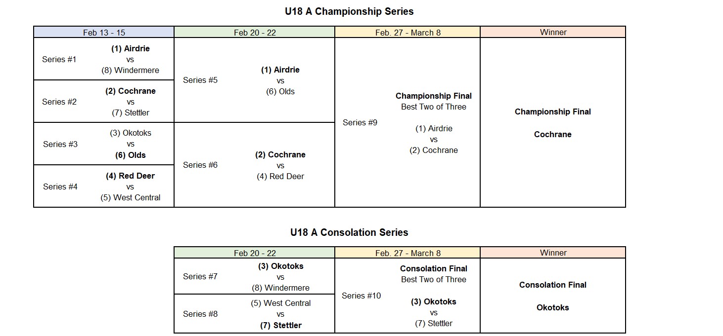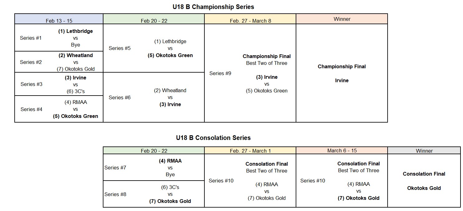 Irvine will represent the RMFHL as the U18 B Qualifier and Okotoks Green will represent the RMFHL as the Wild Card Qualifier for the Provincial Championships, March 19 - 22 in Fairview.